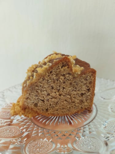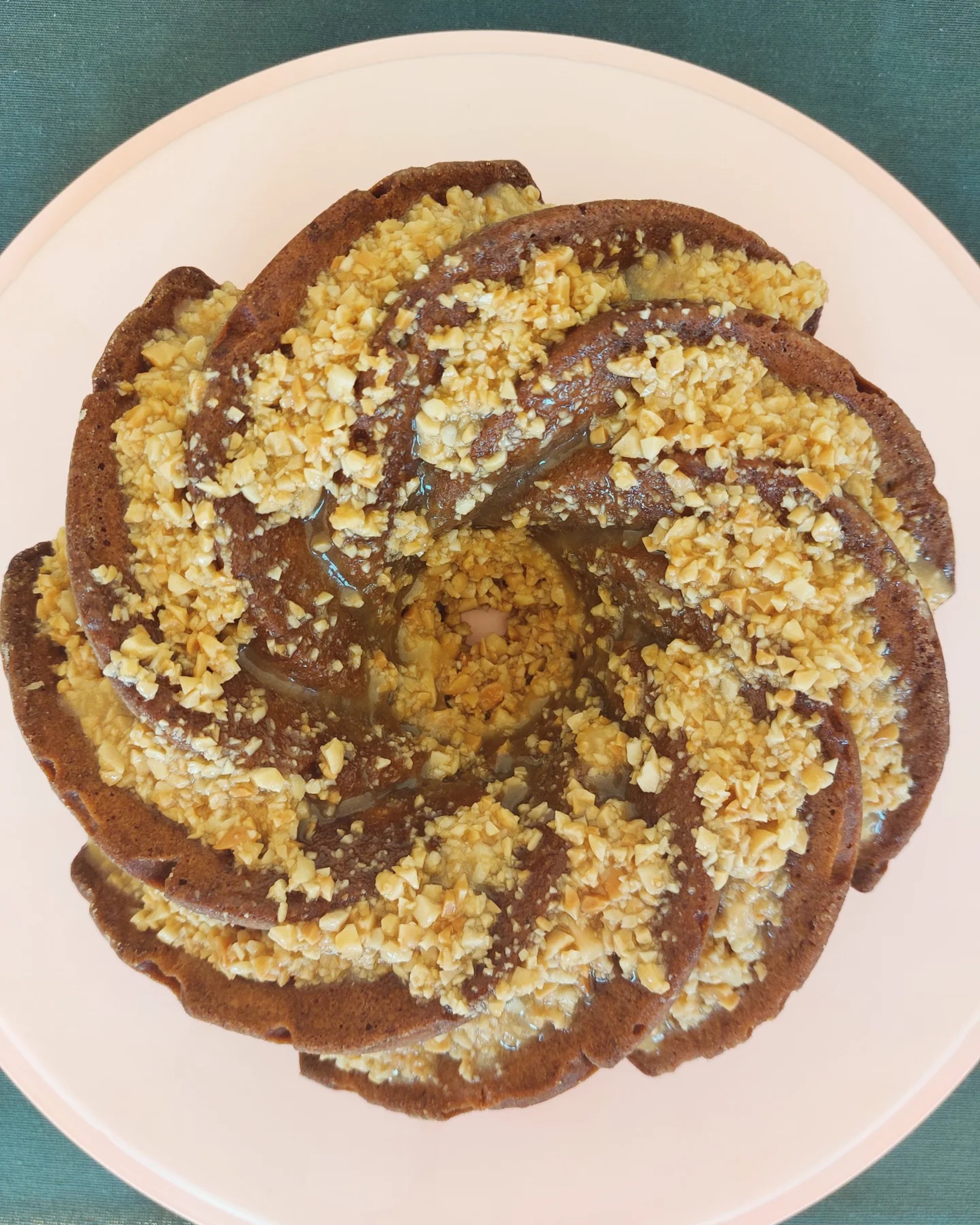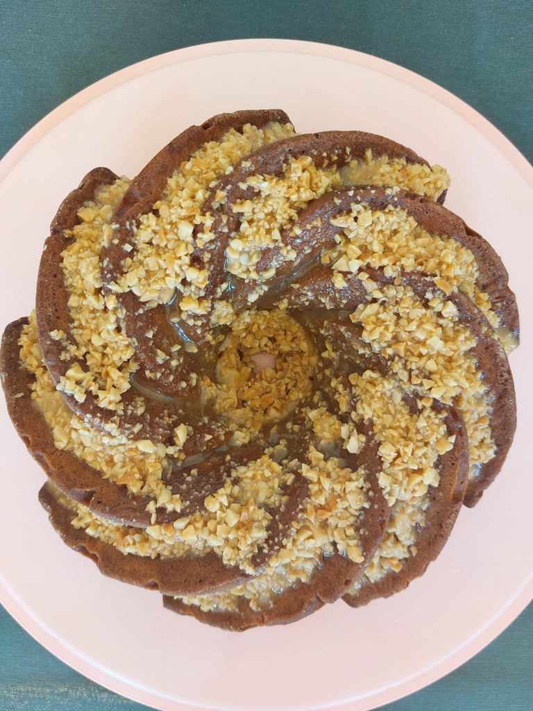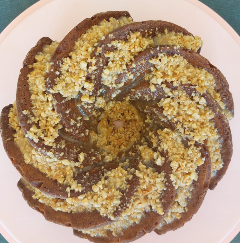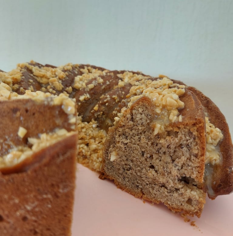 Pindakaas en bananen zijn al een klassieke combinatie. Wij hebben ze in een tulbandvorm gestopt. Om de smaak te versterken, hebben we er een snufje kaneel aan toegevoegd. Maar dat is nog niet alles! Het geheel is afgewerkt met een glazuur van honing, boter en gehakte pinda’s, dat vochtigheid, krokantheid en zoetheid aan de compositie toevoegt. Probeer het en je zult er geen spijt van krijgen!