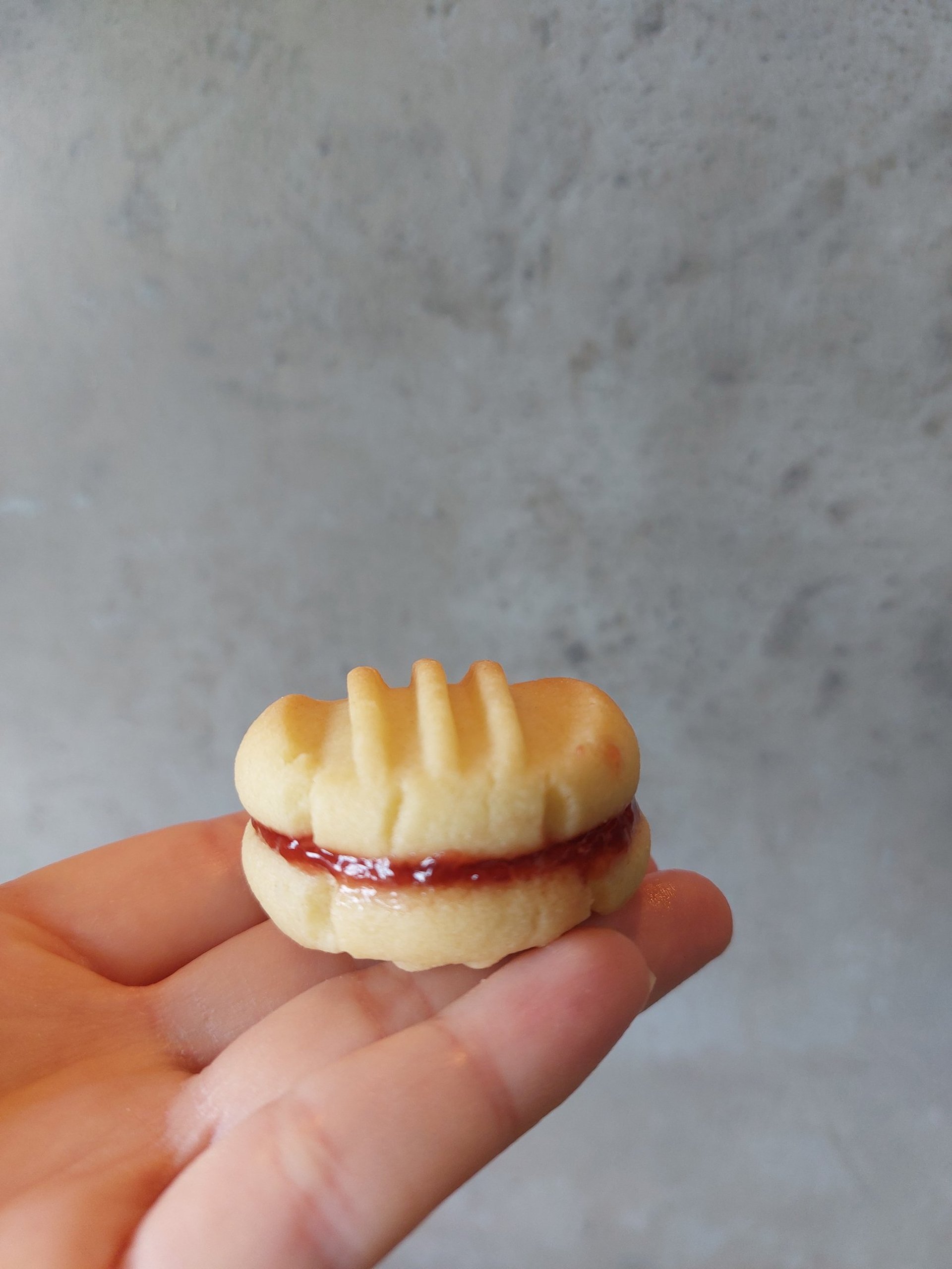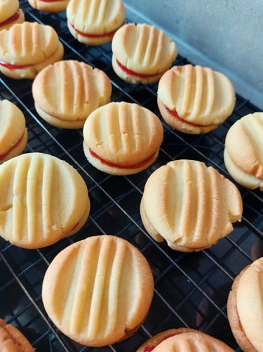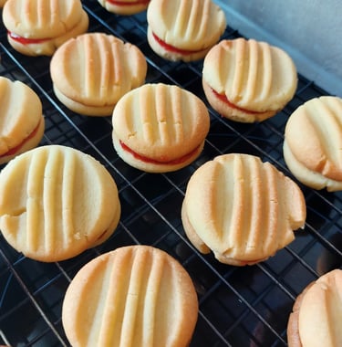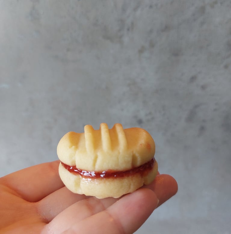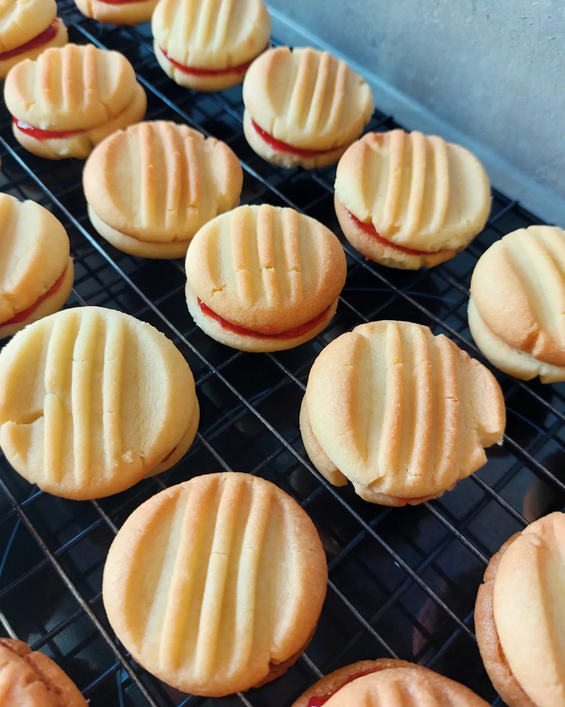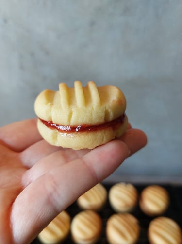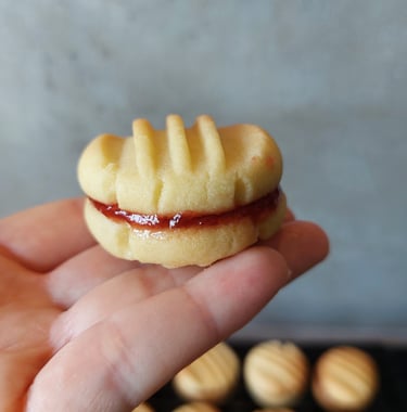 Krokante, boterachtige vanillekoekjes met een eenvoudig vorkpatroon. Bij mij thuis stonden deze koekjes bijna elk weekend op tafel. Het geheim is altijd al heerlijke jam geweest, hier aardbeienjam. Als ik ze eet, ga ik altijd terug naar mijn kindertijd toen ze erg populair waren en ik er veel van at in verschillende smaken, maar de aardbei vond ik altijd het lekkerst.